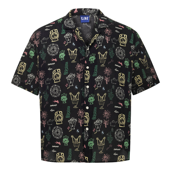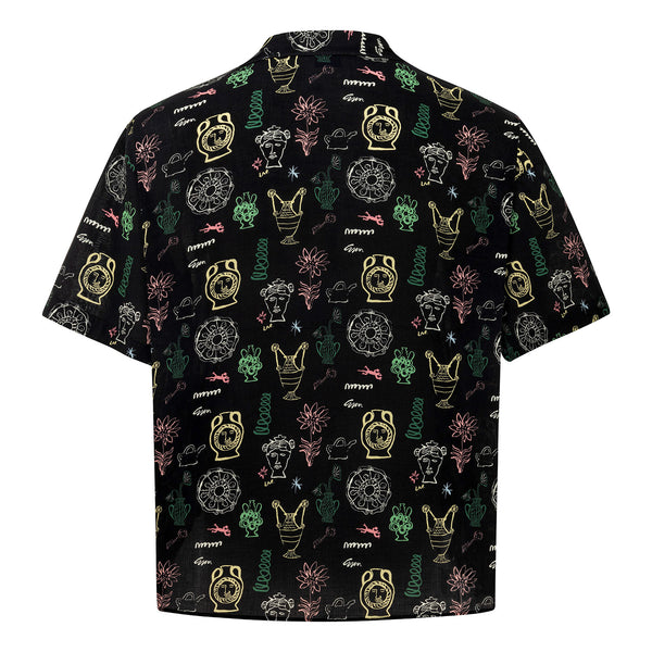 Elevate your wardrobe with the Sculpture Print Short-Sleeve Shirt, a statement piece that blends art and fashion effortlessly. Inspired by ancient motifs and contemporary line art, this bold design features intricate sketches of sculptures, vases, and abstract elements against a sleek black backdrop.